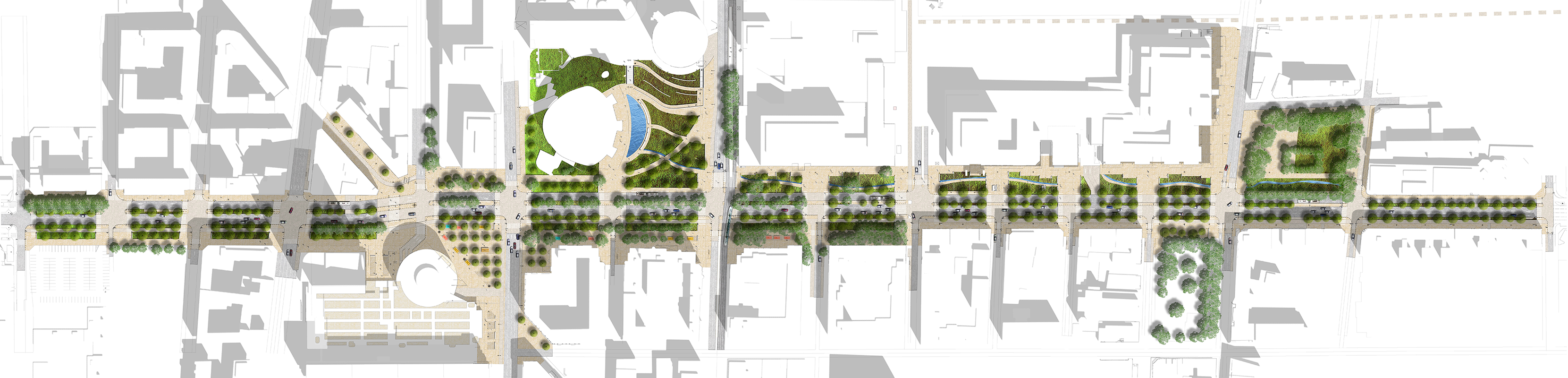 - Les espaces connexes à la chaussée sont investis pour casser la linéarité de la voie et laisser la vie s’installer : terrasses, déambulation, pauses…