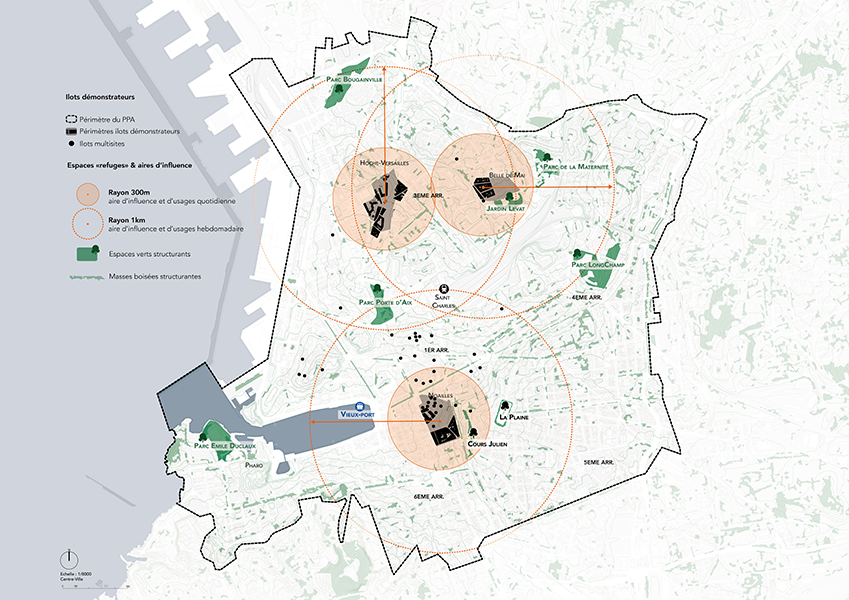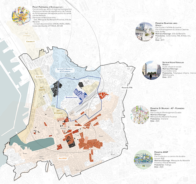Notre démarche se caractéristique par un travail d’investigation patrimoniale, qui révèle les permanences historiques comme catalyseurs du projet urbain. Cette « rétro-prospective » permet de définir la manière dont la ville et les usages peuvent évoluer, pour créer des espaces urbains cohérents capables de tendre vers une mixité d’usages, de complémentarités, de richesses humaines qui font sens pour l’urbanité de Marseille.