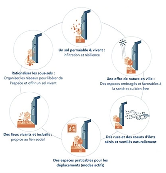 Le projet propose de considérer pleinement le vivant, retrouver des sols fertiles, donner les conditions à la nature pour jouer un rôle régulateur par un maillage d’espaces et de coordinations des trames brunes et noire, des trames du végétal et de l’eau, des trames patrimoniales et d’intensité d’usages…