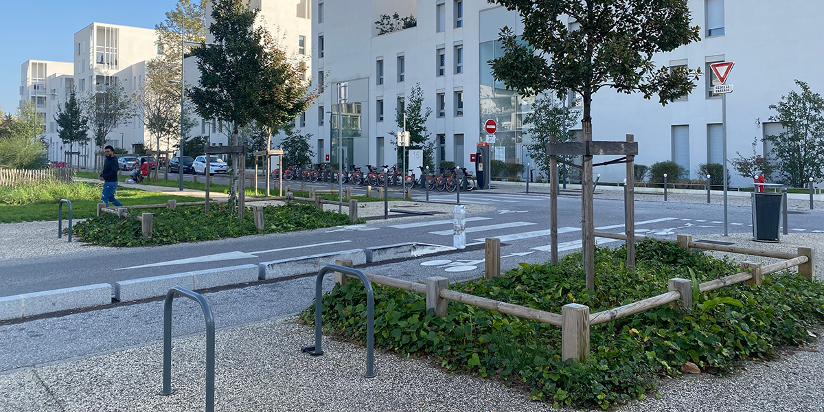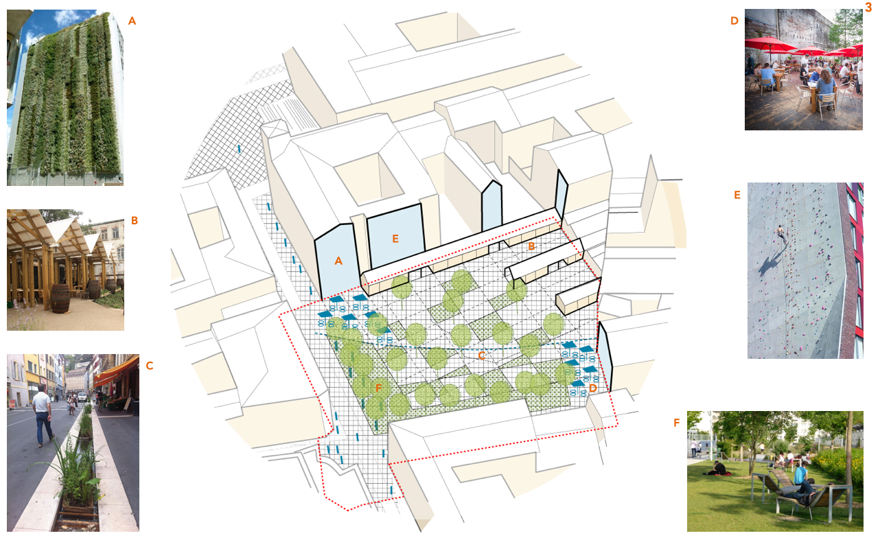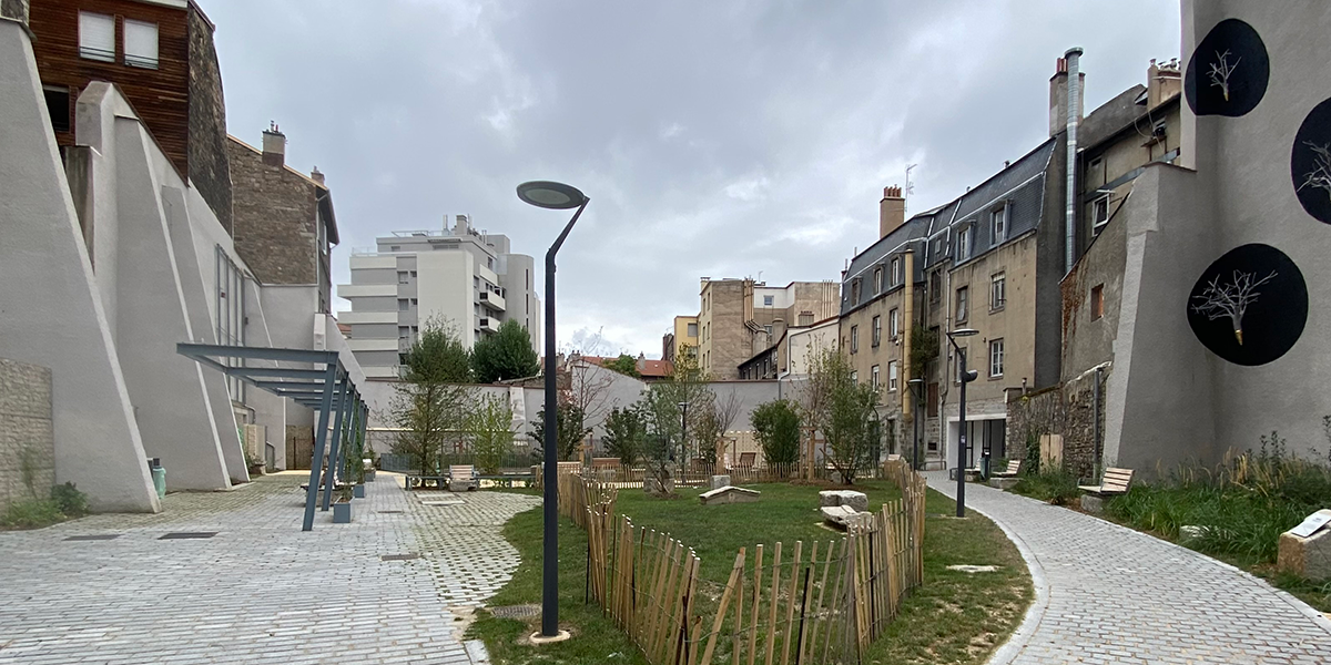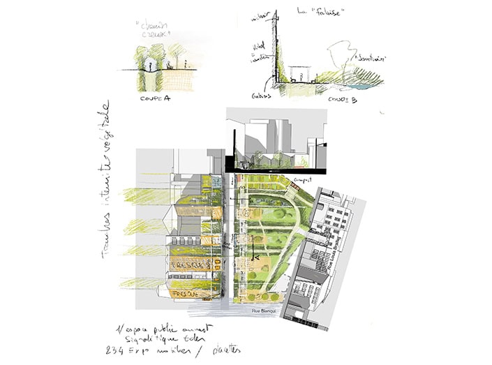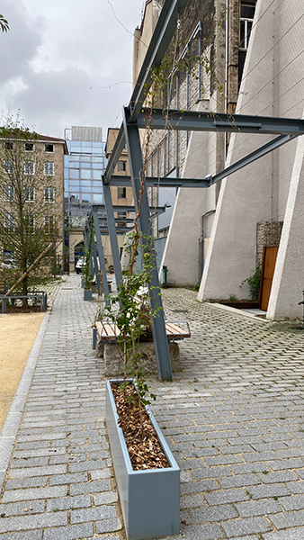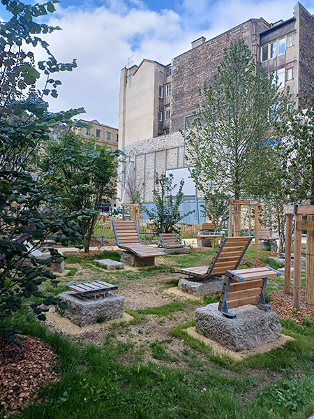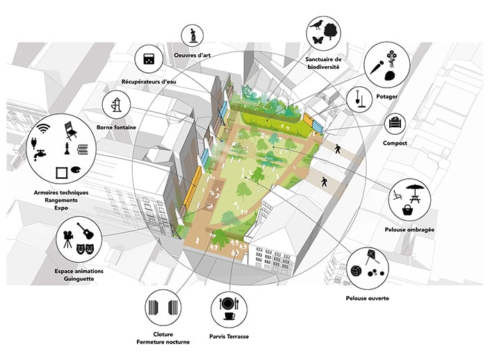 L’agence conçoit un jardin vivant, dont les espaces se font de plus en plus intimes à mesure qu’ils s’éloignent des rues et qui offrent de réelles aménités de confort, de fraîcheur, de pause dans la ville. Une véritable « surprise nature » au coin de la rue.