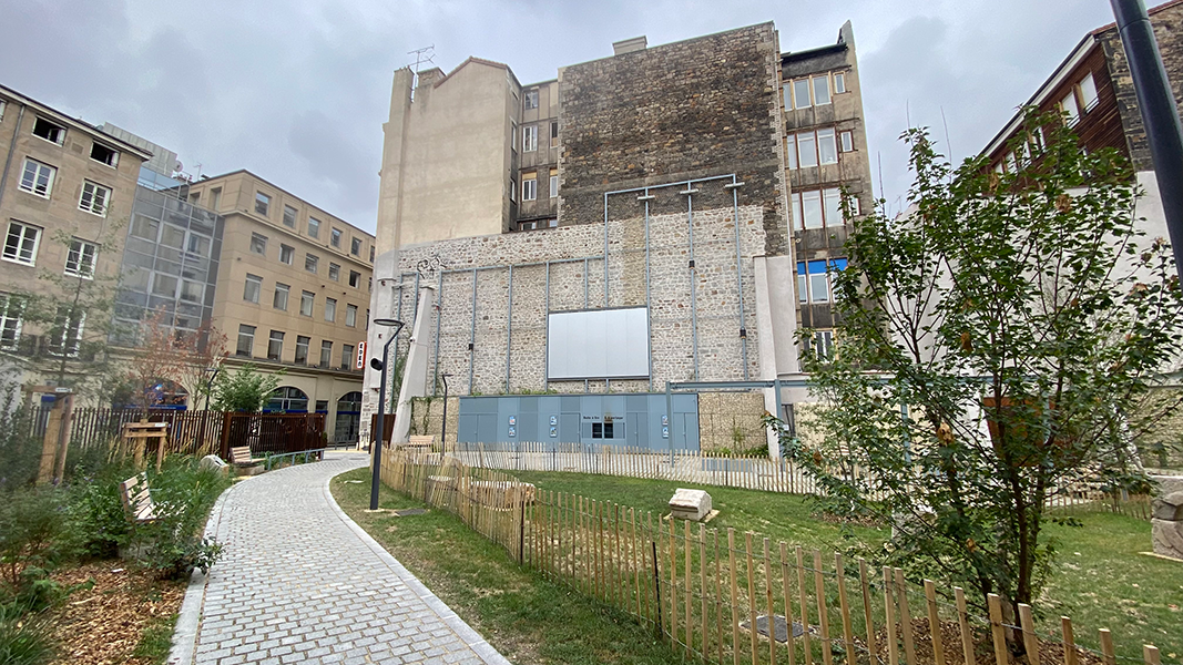 L’aménagement élabore une scénographie, hommage au cinéma, pour apporter des oeuvres d’art dans l’espace public en les insérant au mieux dans la trame du récit paysager d’ensemble. La forme ronde est ainsi un fil conducteur : à la base de l’oeuvre de Thomas Goux (« Vergers ») ou dans le dessin de serrurerie des clôtures. Le projet s’appuie sur les pignons et les contreforts issus de la démolition pour créer un paysage vertical et végétalisé. Le réemploi des pierres, les anciens accès du cinéma transformés en passages couverts et la réutilisation de l’enseigne et des portes-affiches font vivre la mémoire du lieu dont le jardin Eden tire son nom. Un écran de cinéma intégré sur l’un des murs pignons boucle la boucle !